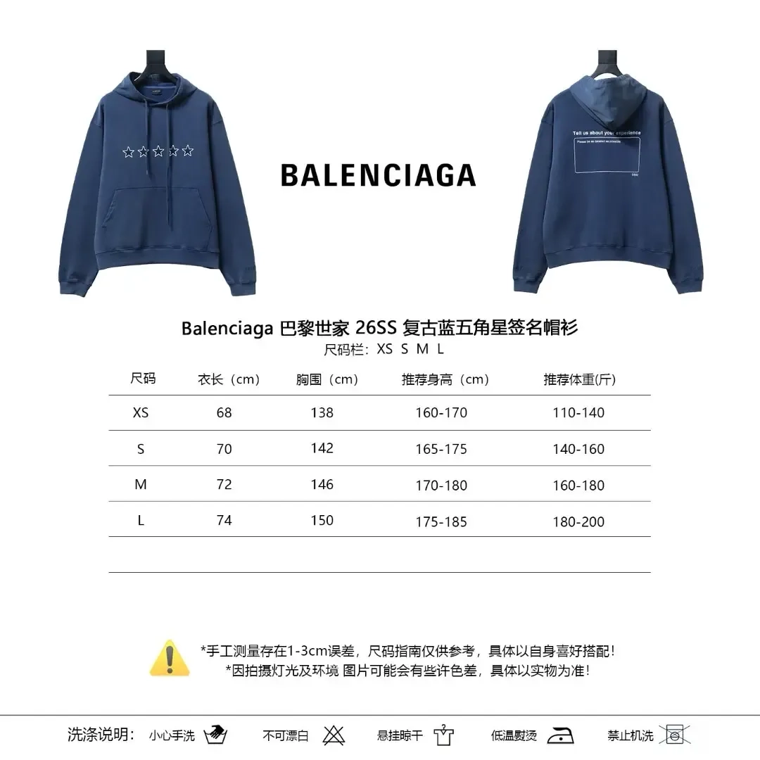 Balenciaga 26Ss Retro Blue Hoodie With Five Pointed Star Logo