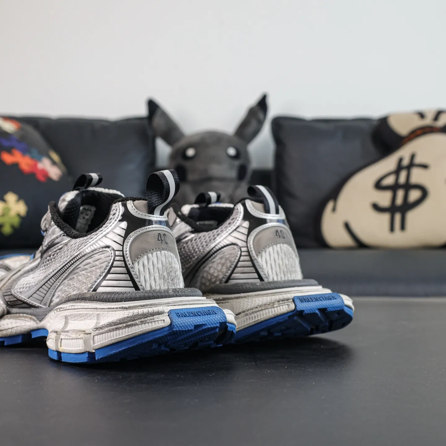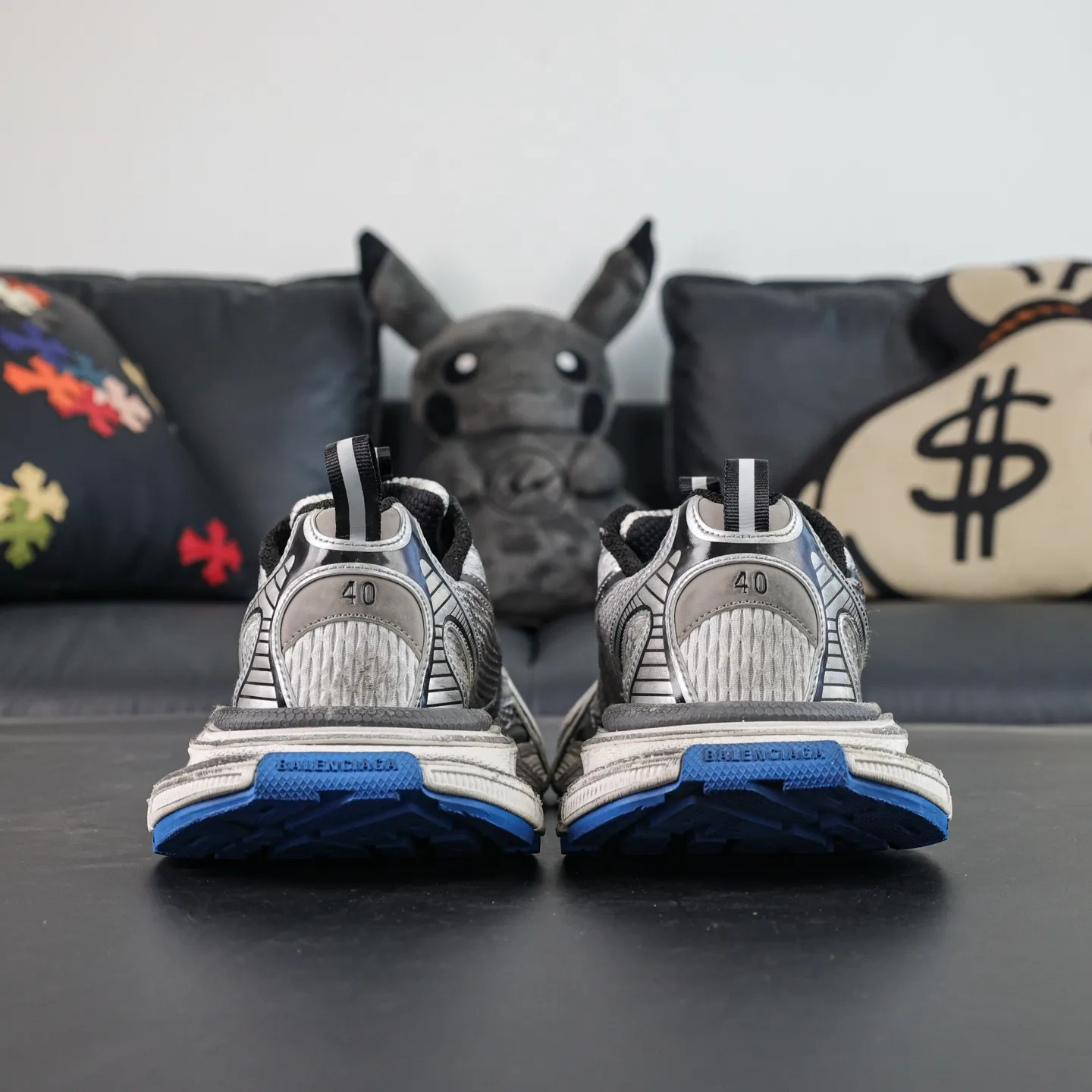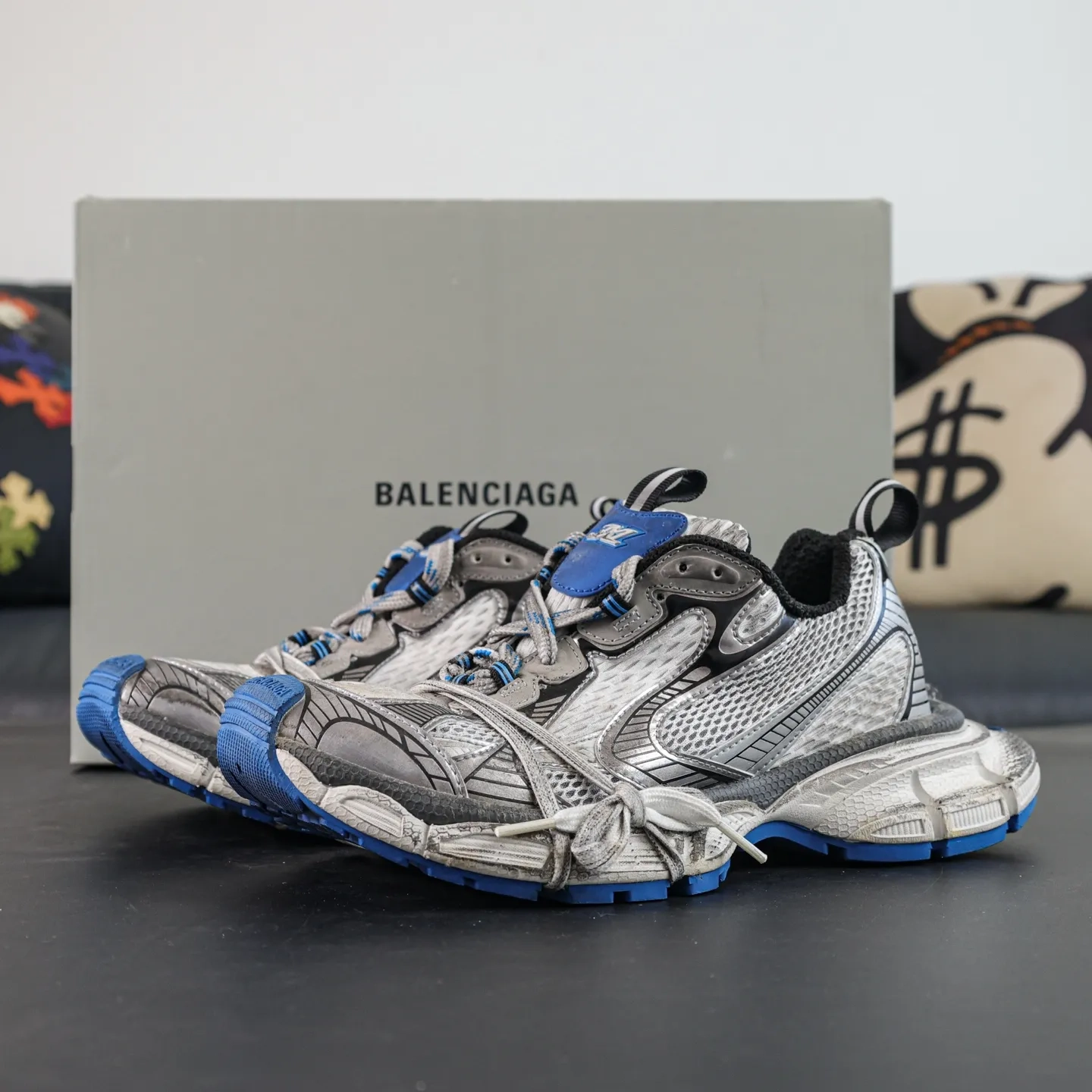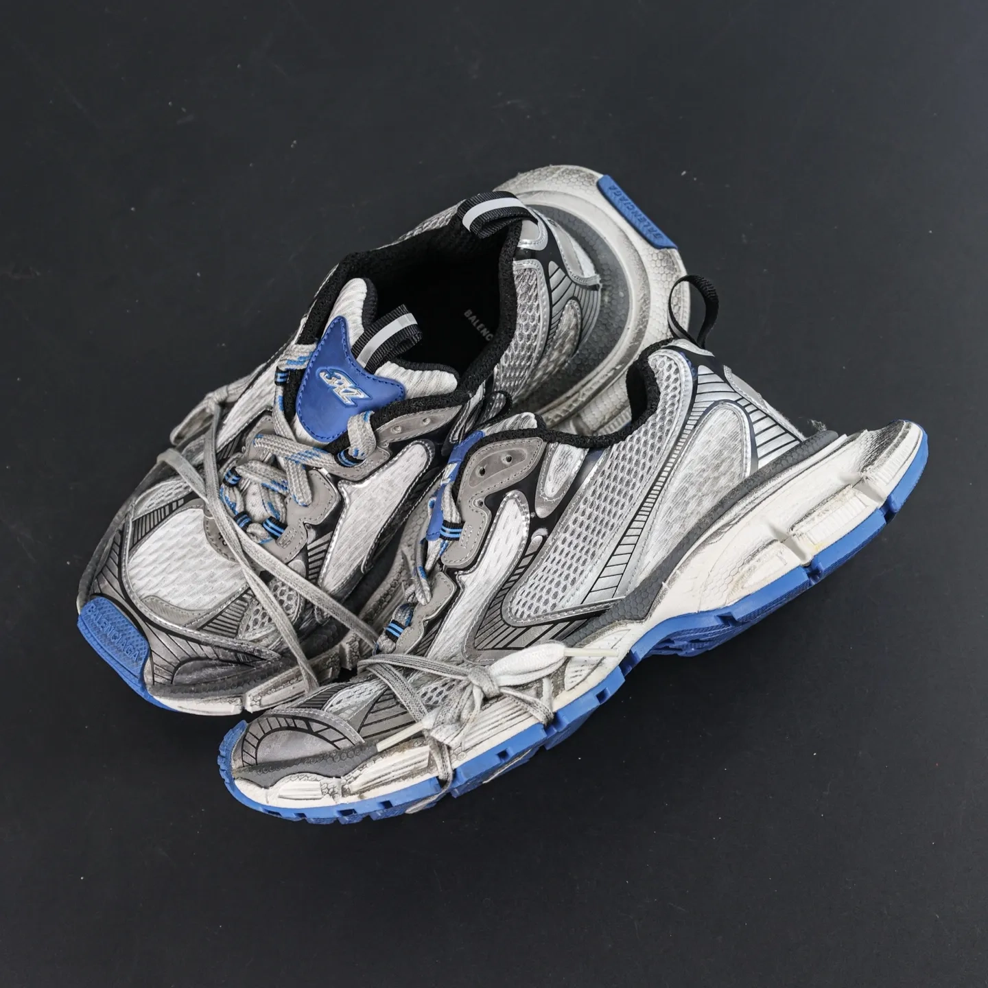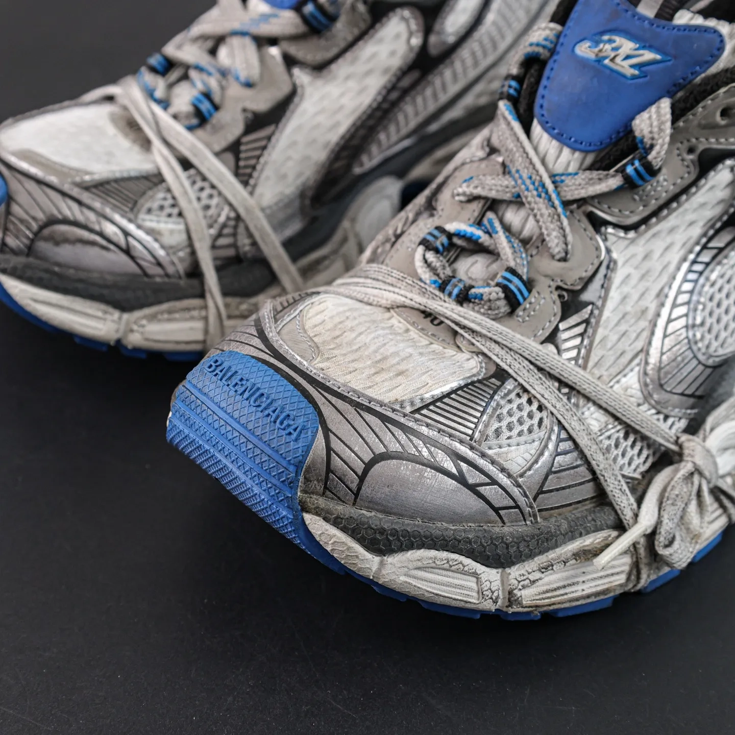The upper features alternating grey and blue tones, giving it a worn, aged look, as if it bears the marks of time. This “worn” design makes the sneakers appear both retro and modern and underscores Balenciaga’s unique sense of distressed aesthetics.