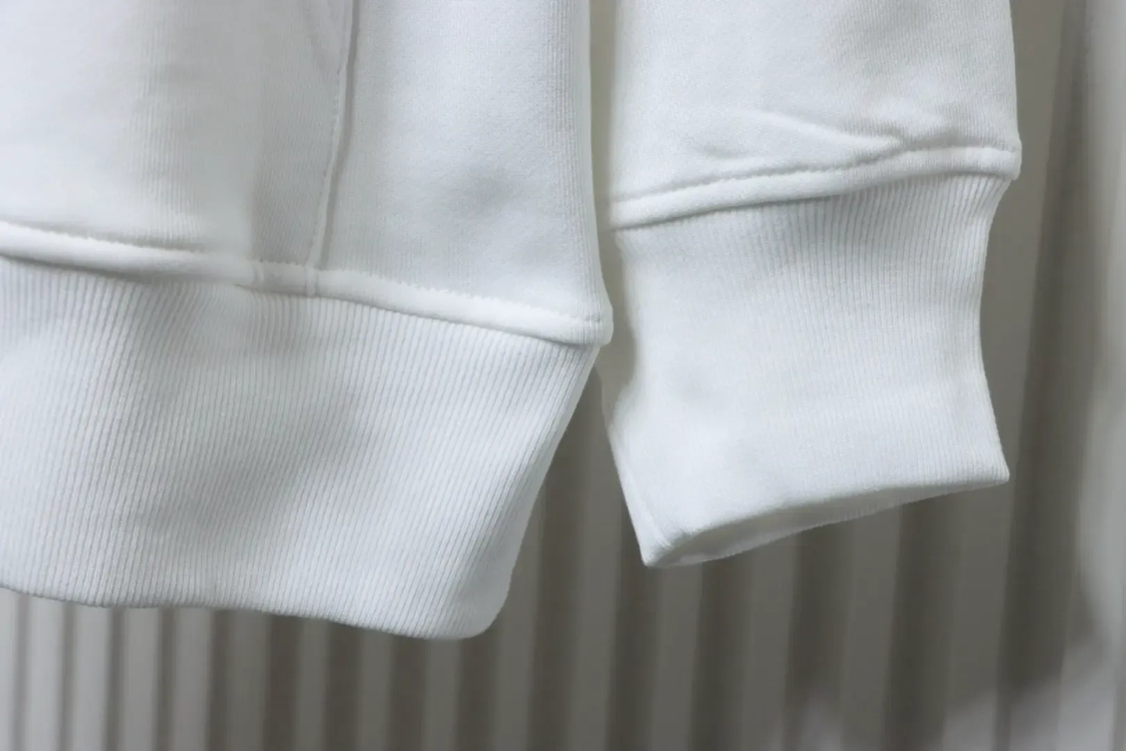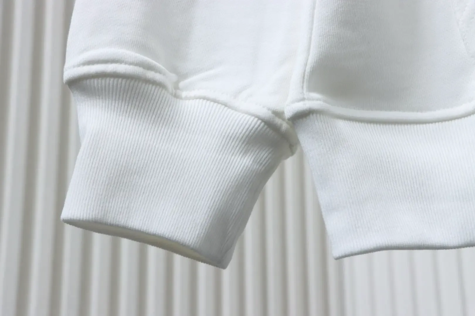 - The white body is simple and uncluttered, featuring a drawstring hood and textured metal perforations.