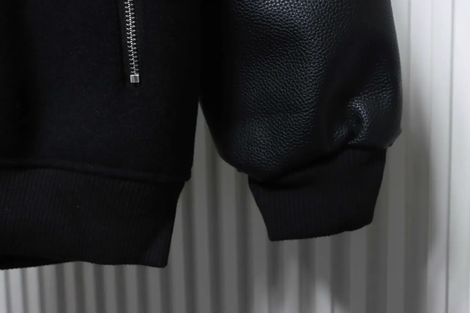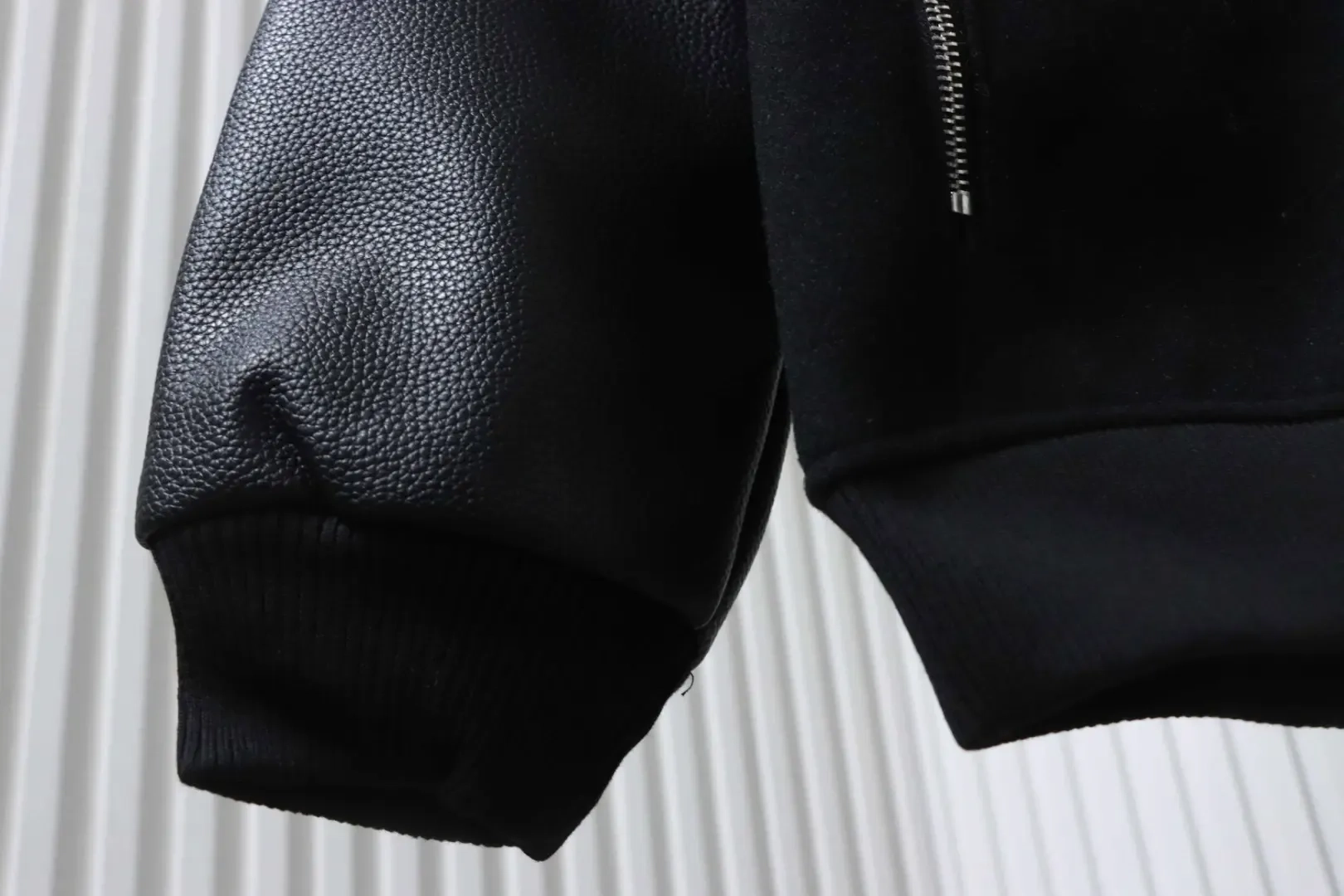 Leather baseball jacket with cross pattern and several brand logos on the sleeves XXL Leather baseball jacket with cross pattern and several brand logos on the sleeves XXL