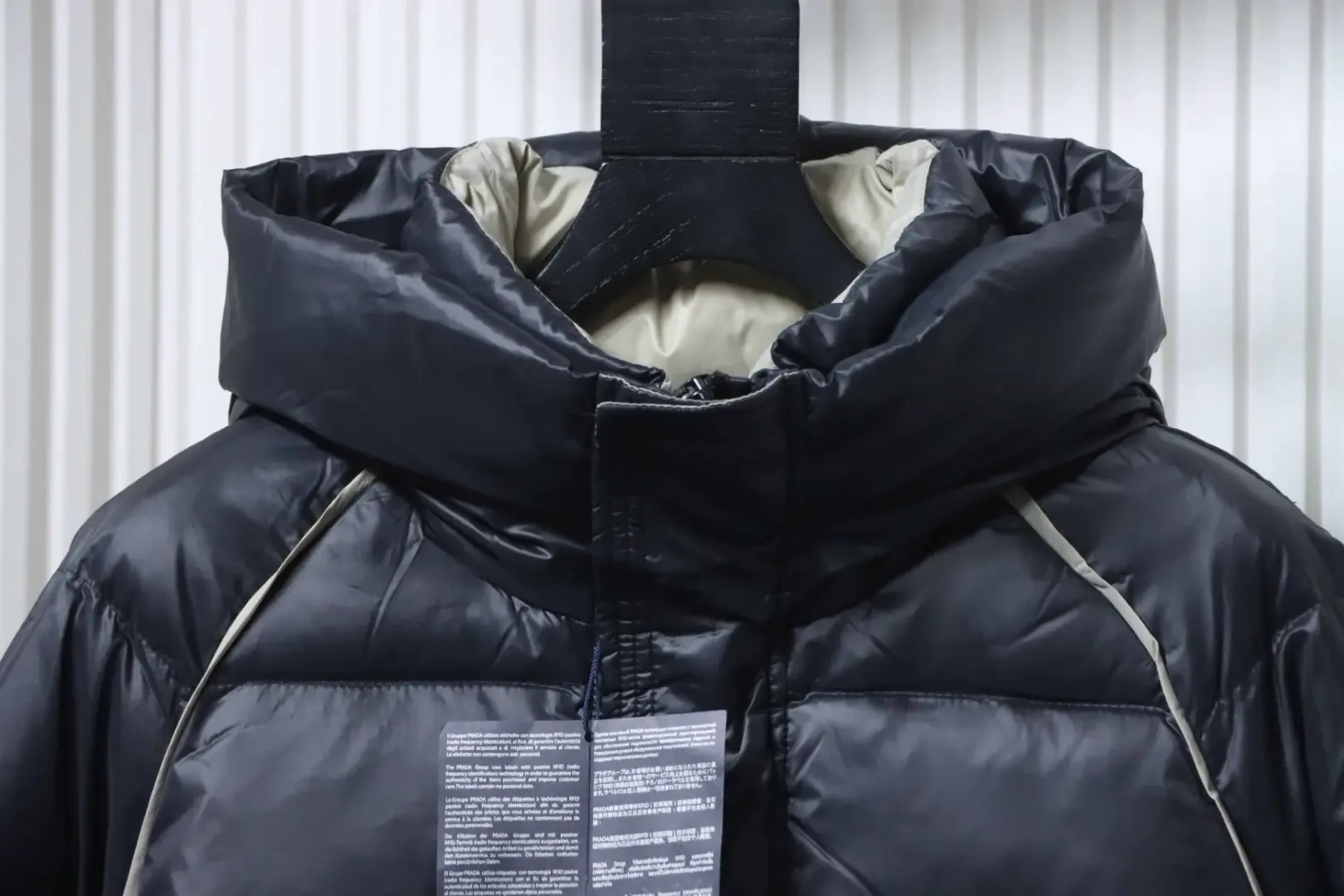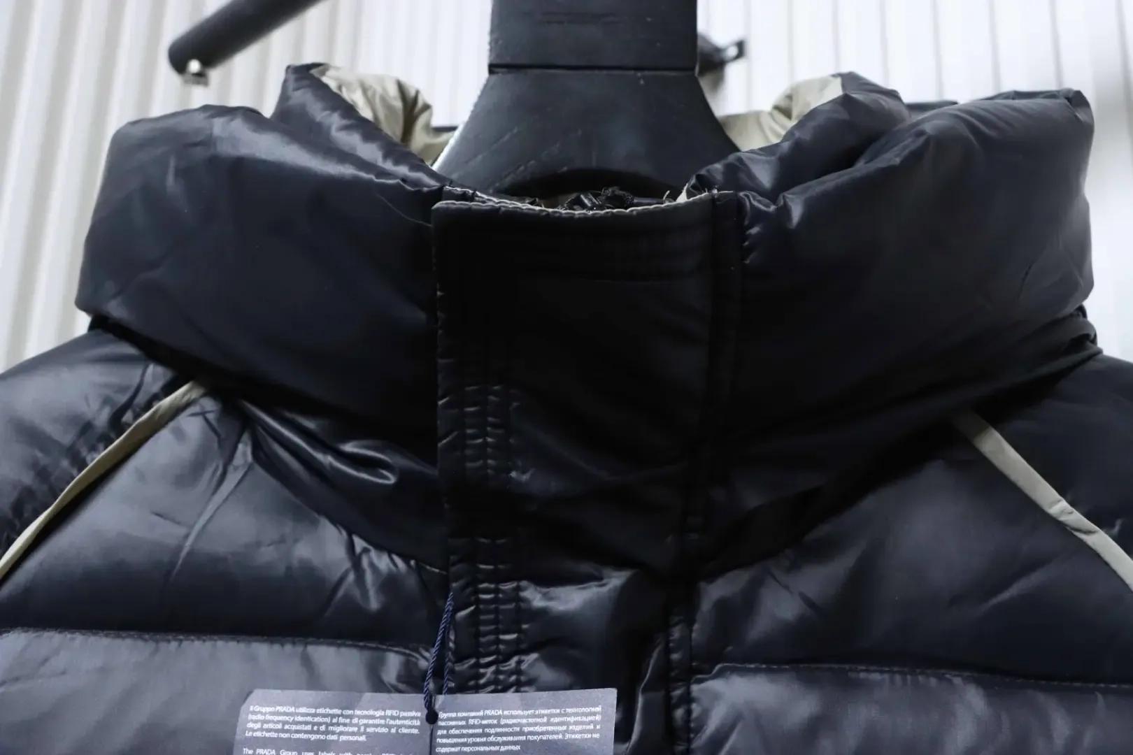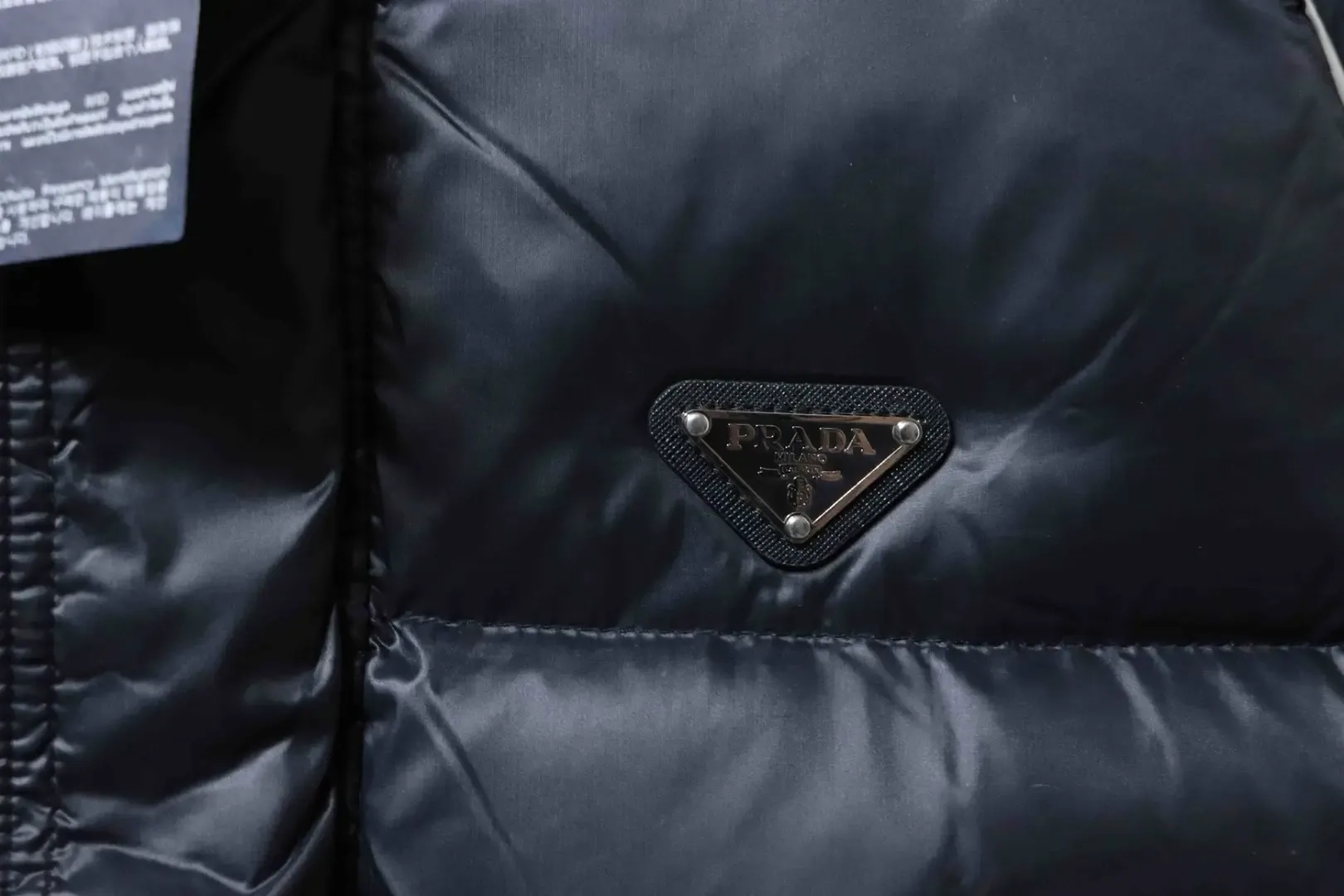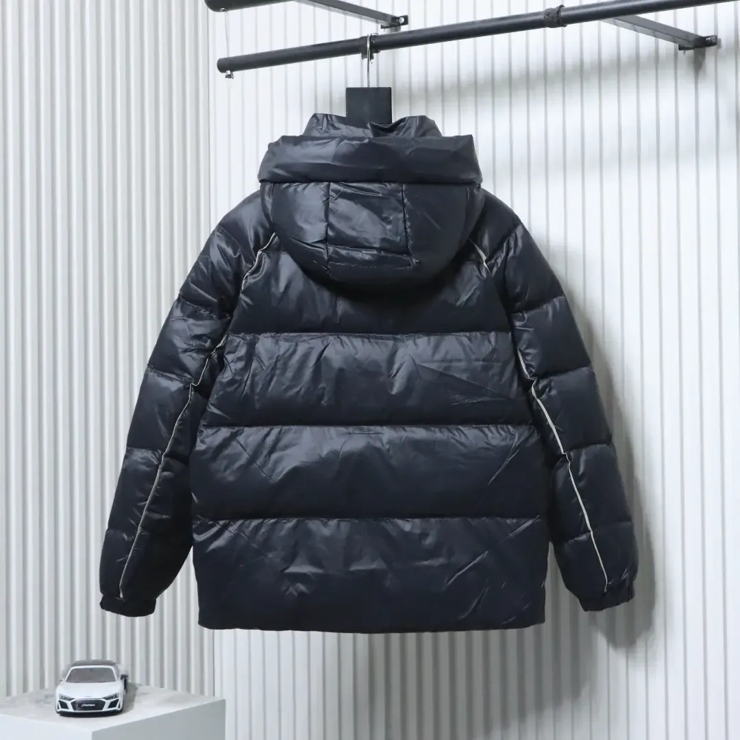 Metallic Triangular Logo Down Jacket With Hood And Wide Brim Metallic Triangular Logo Down Jacket With Hood And Wide Brim