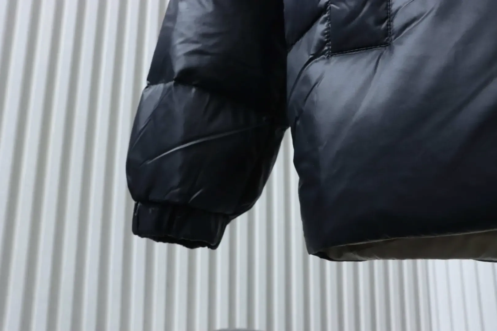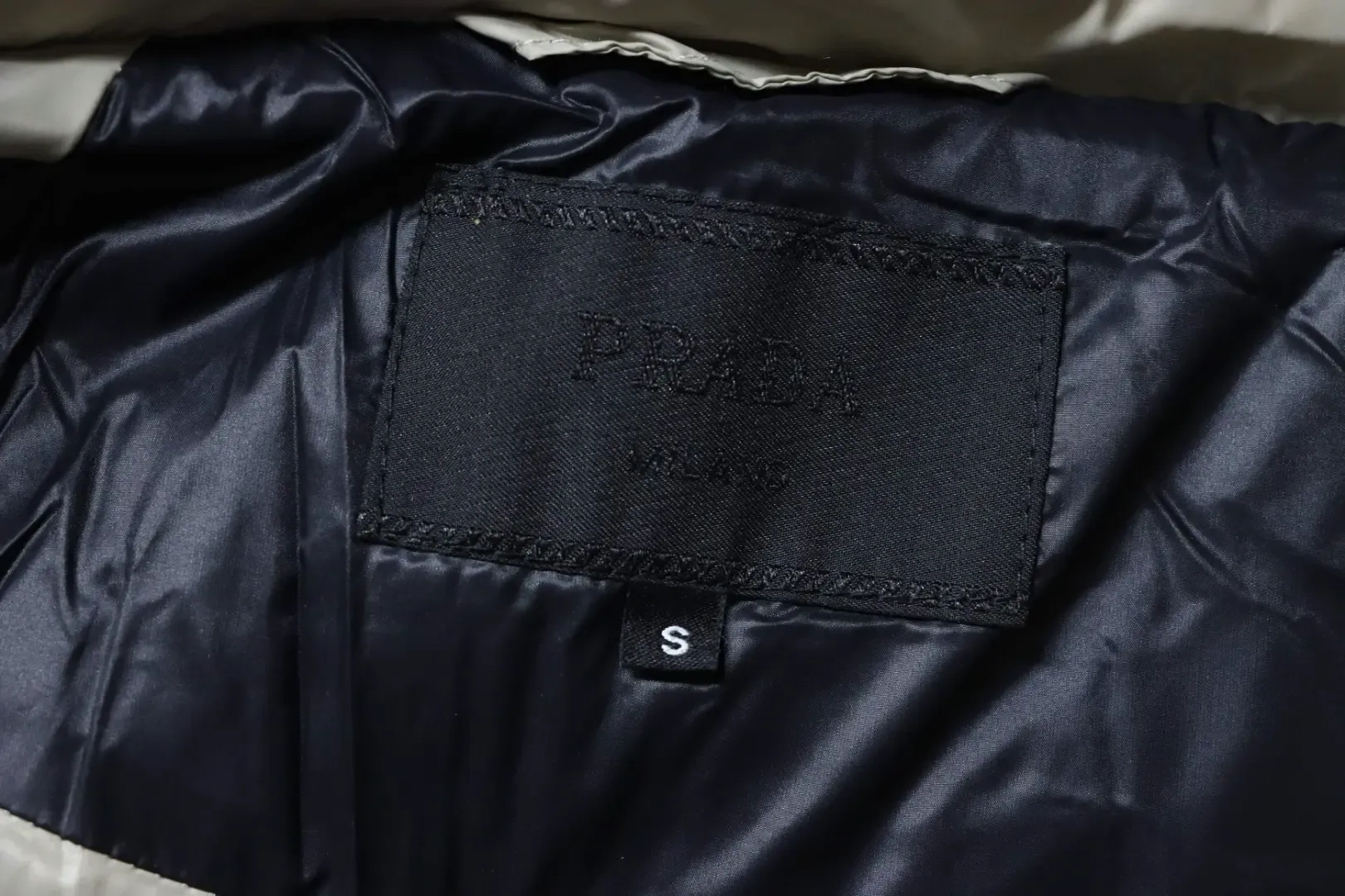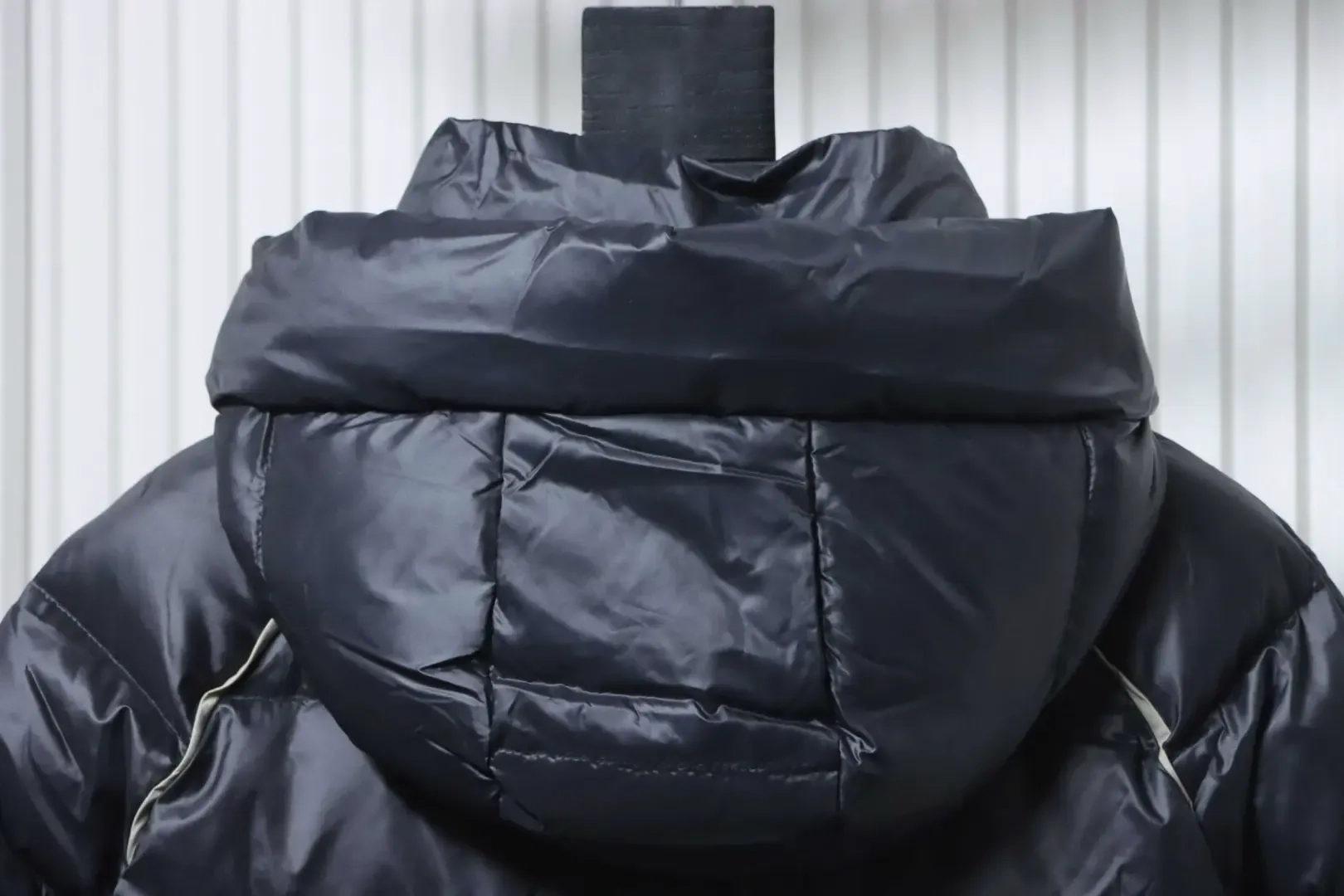 Metallic Triangular Logo Down Jacket With Hood And Wide Brim Metallic Triangular Logo Down Jacket With Hood And Wide Brim