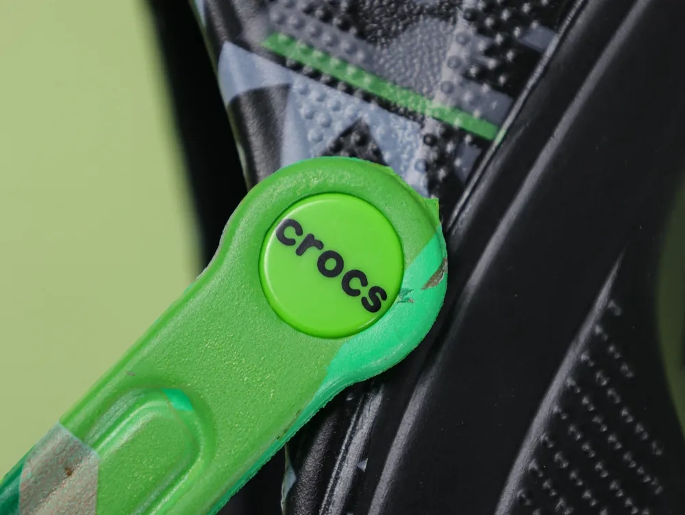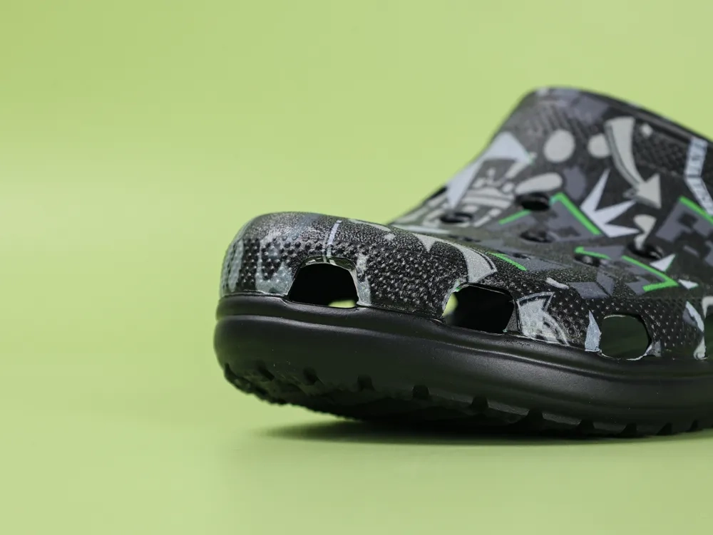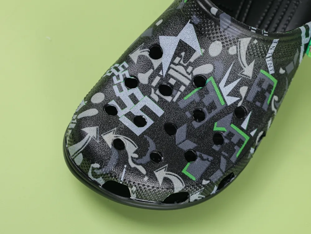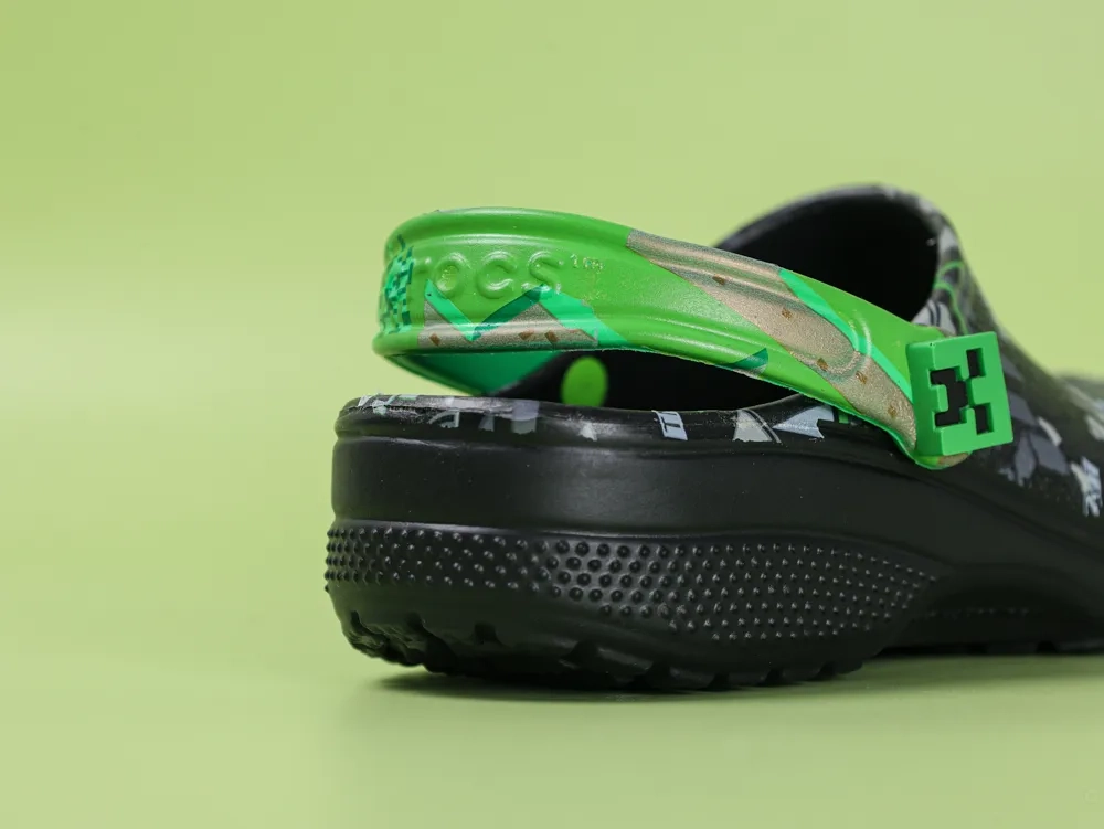 The Crocs Classic Clog “Black-Multicolor” combines a black base with colorful Minecraft elements to create a visually striking, collaborative style. The classic silhouette and eclectic color combination make a statement whether you’re walking down the street or exploring the pixel world.