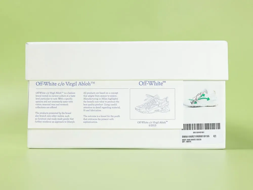 The Off-White ODSY-2000 “White Green” uses a crisp white and a vibrant light green as its base colors, complemented by the brand’s signature orange details in an industrial style, resulting in a striking look. The color scheme combines streetwear and modernity and lends itself to a variety of styling options.