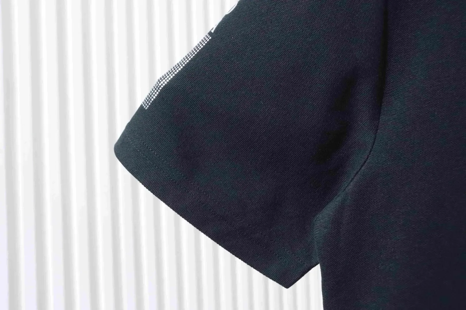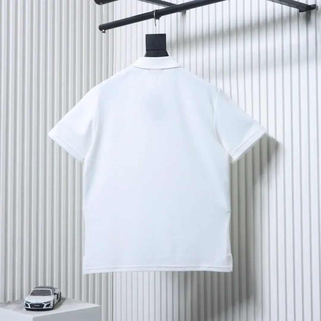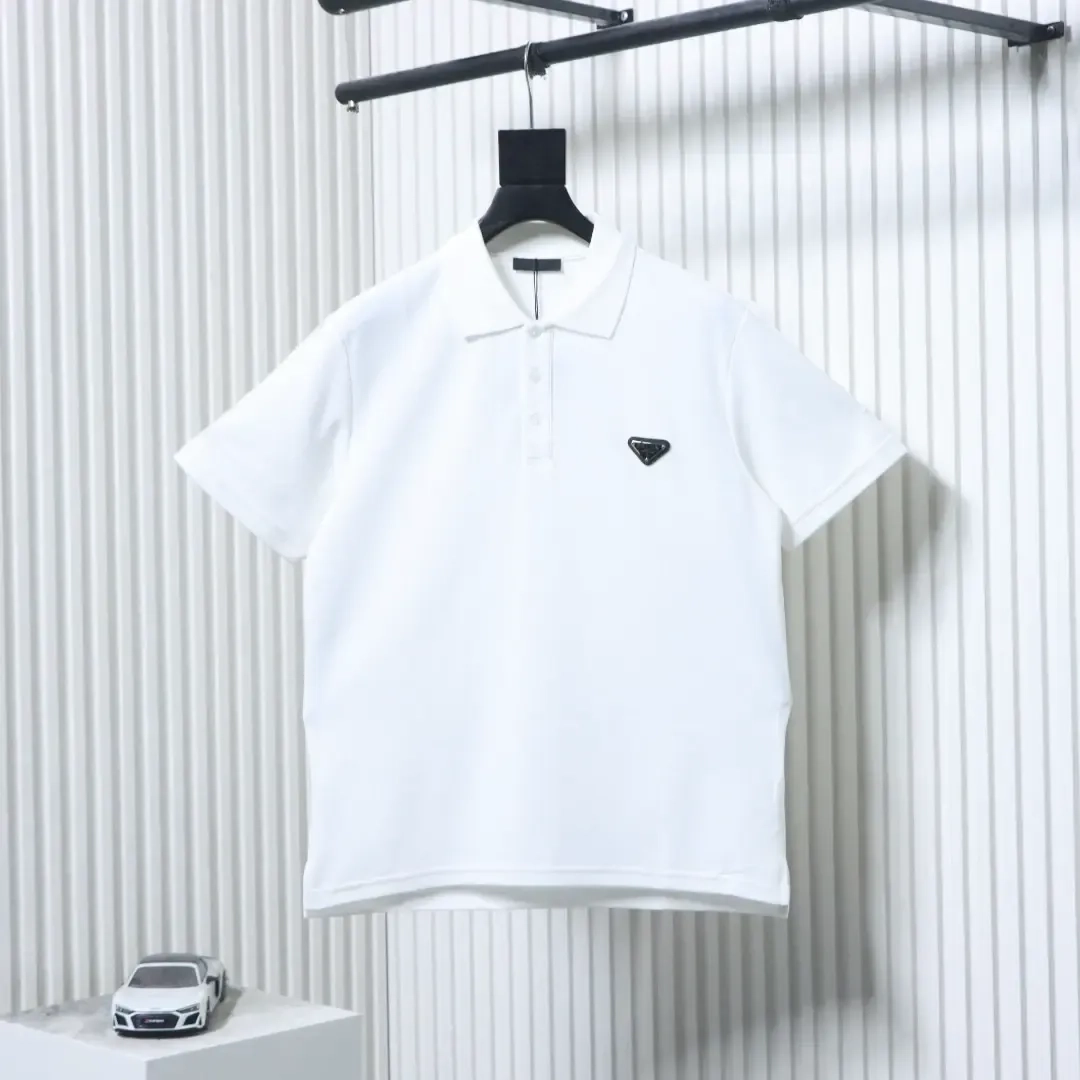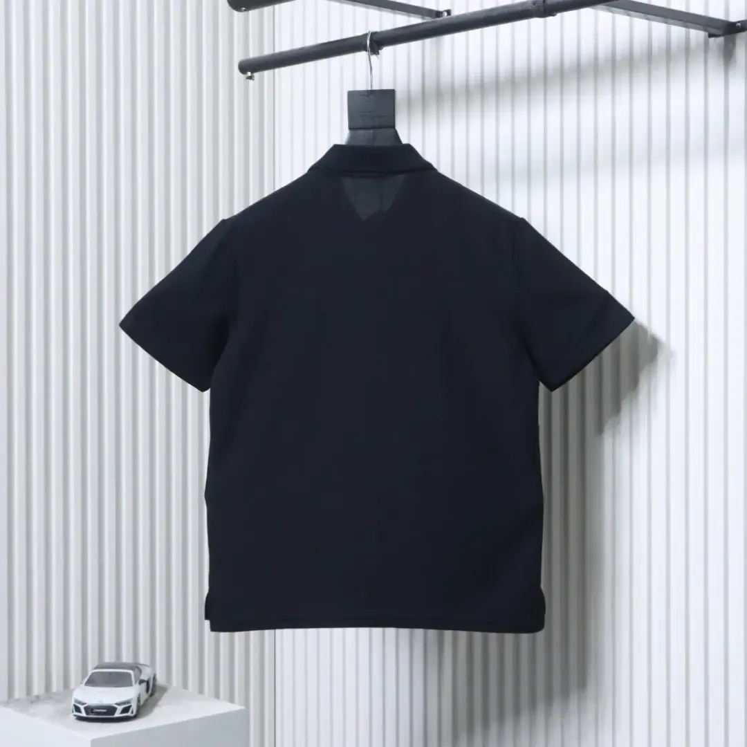 Short-sleeved polo shirt with metallic triangle logo and silver lettering on the sleeve cuffs