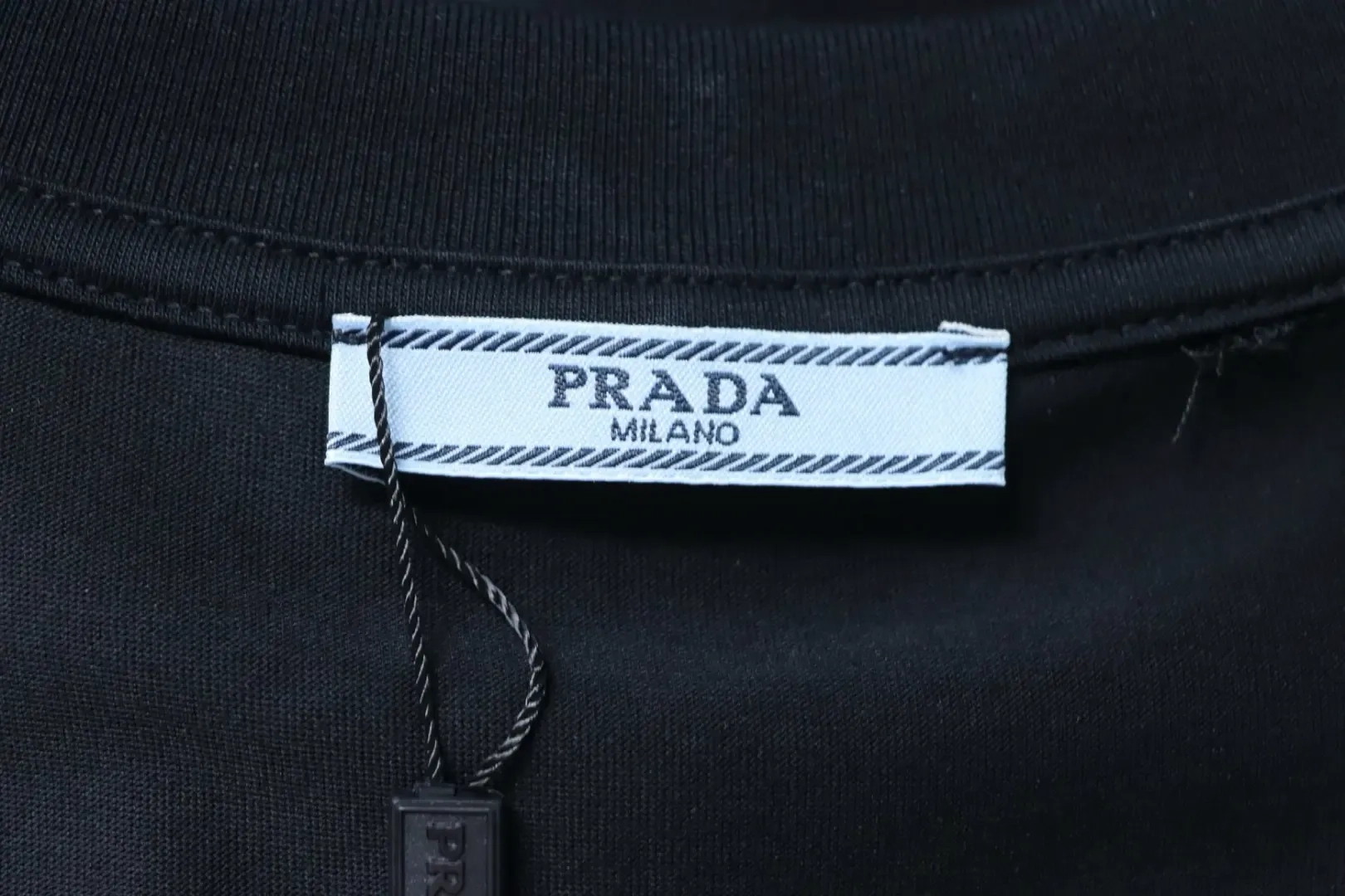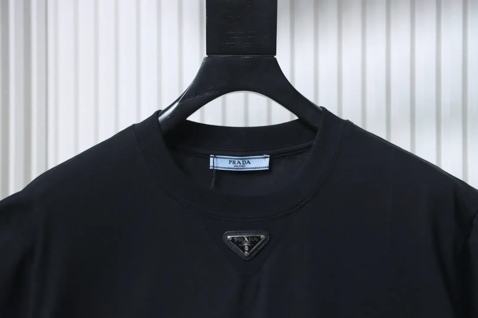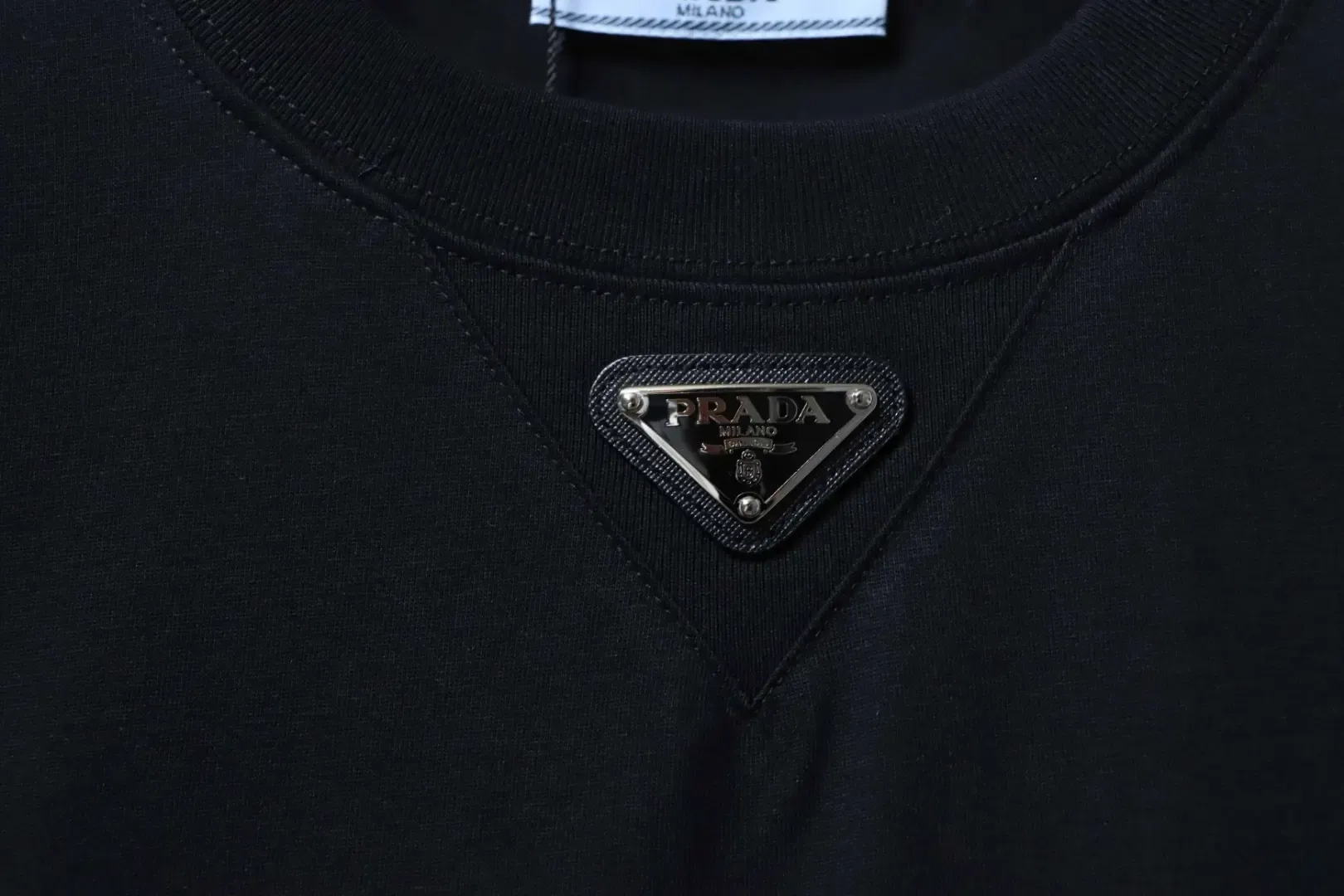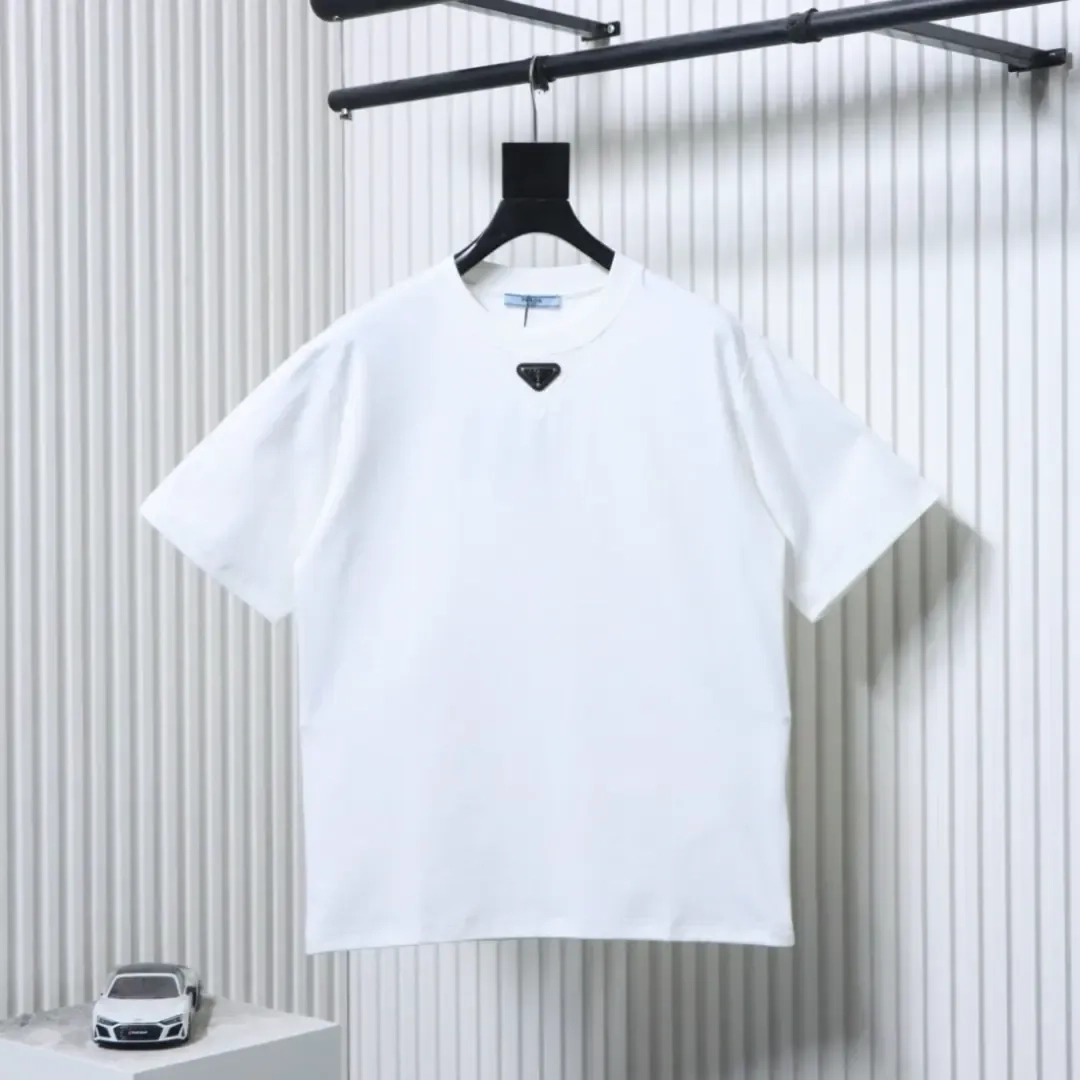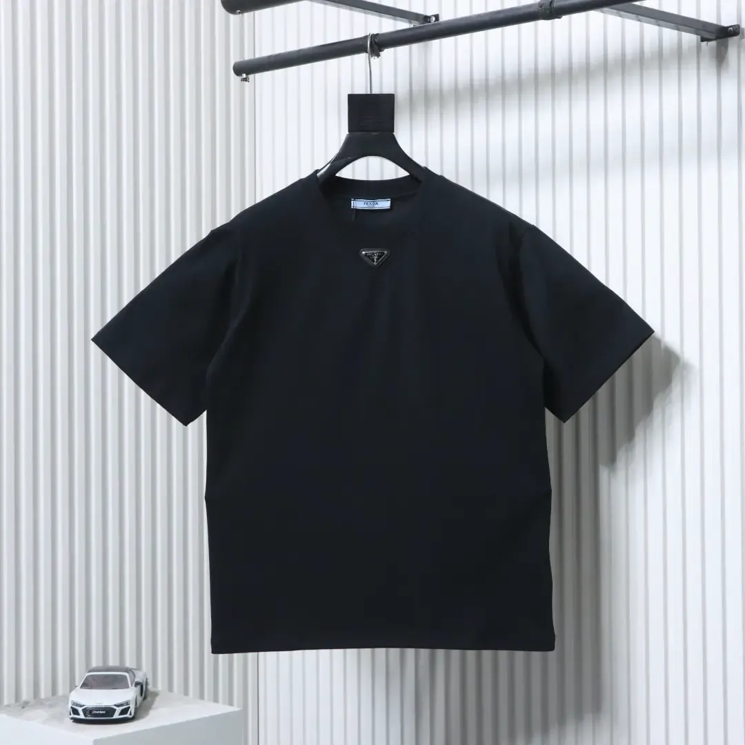 - P140 PRADA Short-Sleeve T-Shirt with Metal Triangle Logo at the Neckline